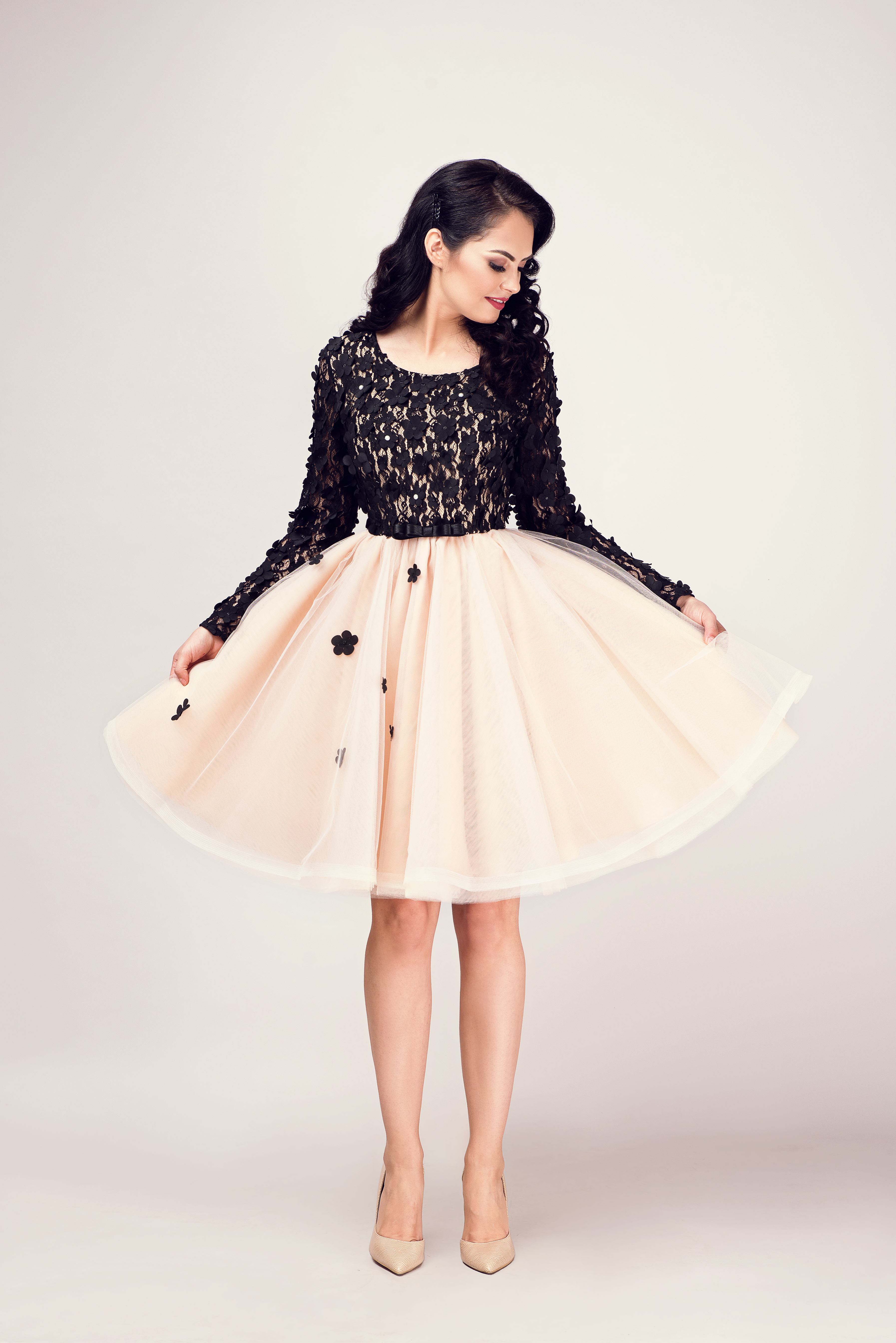 Mother Daughter Matching Black Daisy Dresses made of black lace with 3D flowers, fine tulle with silk content, lined with silk satin and applied rhinestones, with hidden zipper at the back.