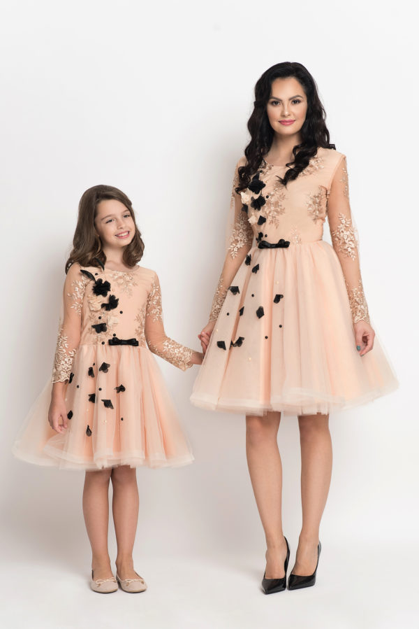 Mother daughter matching Honey Beige dresses made of embroidery on tulle, classic tulle, beaded applications, half pearls and textile flowers, lined with silk satin, with hidden zipper at the back.
