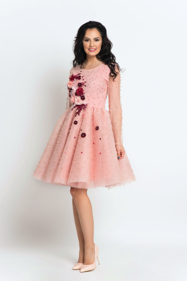 Mother Daughter Matching Peach Pearl dresses made of tulle manually accessorized with pearls, classic tulle, beaded applications, half pearls and textile flowers, lined with silk satin, with hidden zipper at the back.