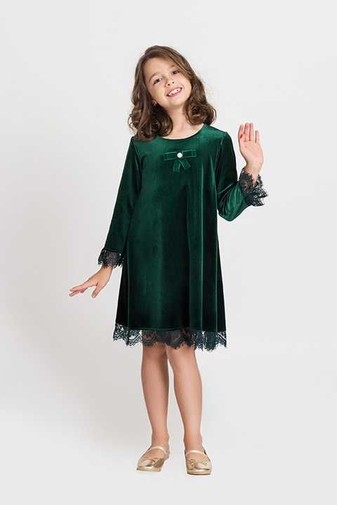 Velveteen Green Dress made of slightly elastic velvet and Chantilly lace.